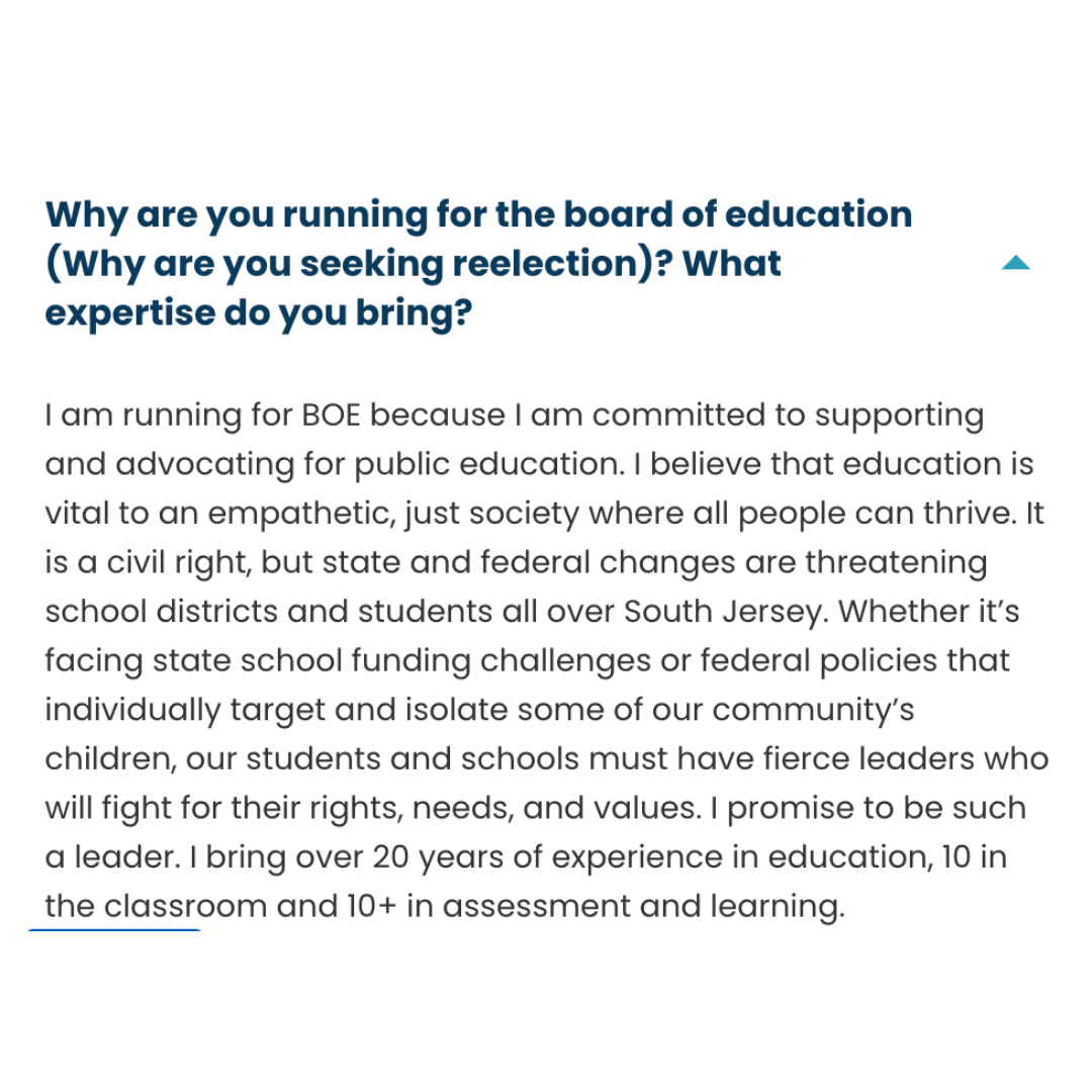 A school district is first and foremost a community that is fueled and enriched by the unique contributions of each member. I am running for the Collingswood Board of Education because in this particularly tumultuous time in education, I want to use my knowledge and skills to help ensure that all students are both supported and celebrated.